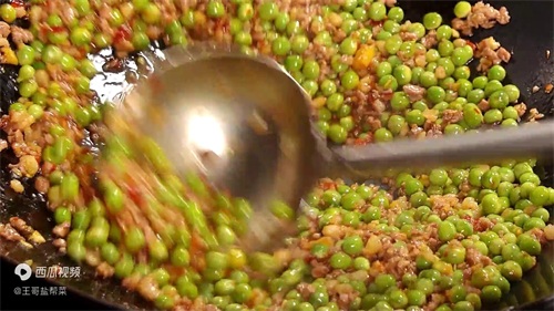 4. 炒凉油后下入豌豆,豌豆下锅用小火翻炒,加点啤酒、酱油,把豌豆收一下,豌豆不容易成熟,啤酒也可以去腥增香。