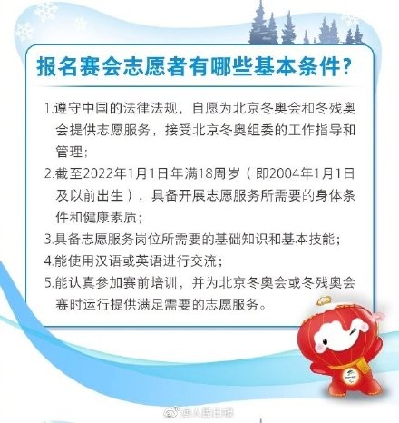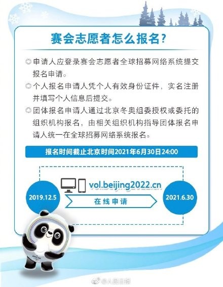 【转存收藏!北京冬奥会志愿者招募网址来了:】报名申请赛会志愿者应具备:①遵守中国法律法规;②截止2022年1月,年满18周岁;③具备志愿服务所需要的基本知识与技能;④能使用汉语或英语进行交流;⑤能提供跨赛时志愿服务等。招募工作从即日起,持续到2021年6月30日。期待!
