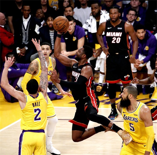 新华社照片,洛杉矶,2018年12月11日(体育)(9)篮球——NBA常规赛:湖人胜热火12月10日,热火队球员韦德(中)在比赛中上篮。当日,在2018-2019赛季NBA常规赛中,洛杉矶湖人队主场以108比105战胜迈阿密热火队。新华社发(赵汉荣摄)