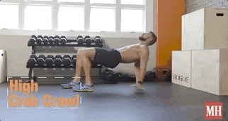 双手双脚撑地,臀部离地,身体呈反弓形。交替移动对侧手脚爬行,保持髋部抬高。控制速度,避免腰部下沉。