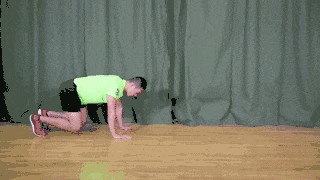双手双脚撑地,膝盖离地,背部平直。交替移动对侧手脚前进/后退。