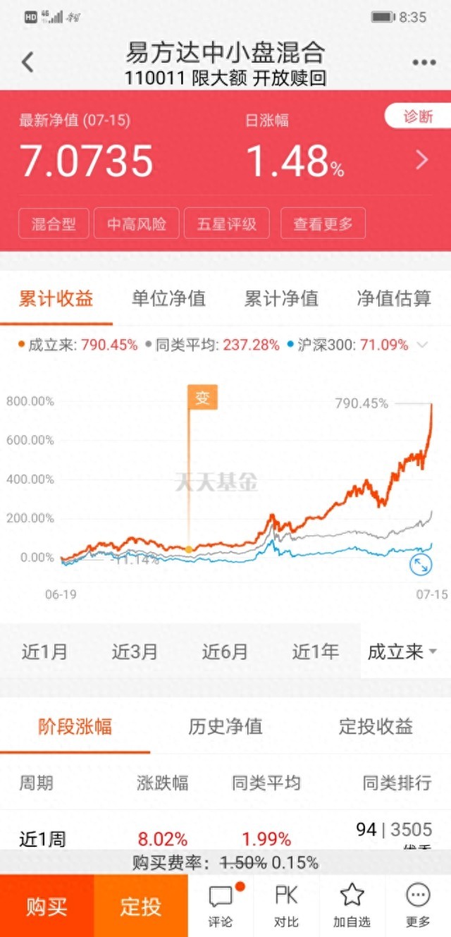 易方达中小盘110011成立以来收益率近800%,离1000%仅一步之遥