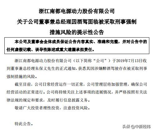 中新经纬客户端7月14日电 14日下午,浙江南都电源动力股份有限公司发布公告称,公司7月13日收到董事兼总经理朱保义先生的正式通知,获悉其因涉嫌醉酒驾驶存在被采取刑事强制措施的风险。