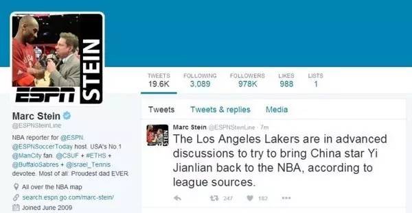 ESPN记者马克·斯泰因推特爆料