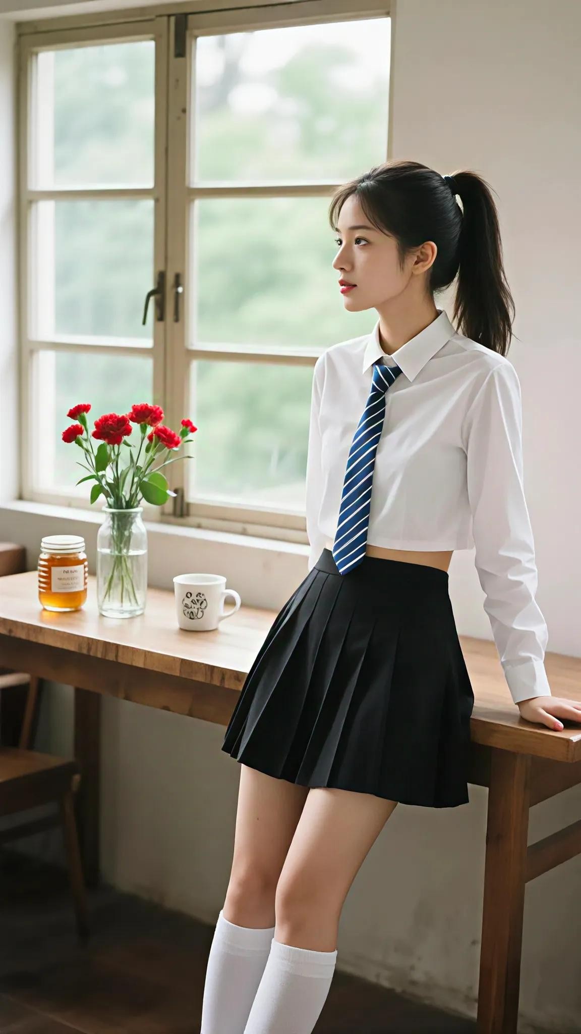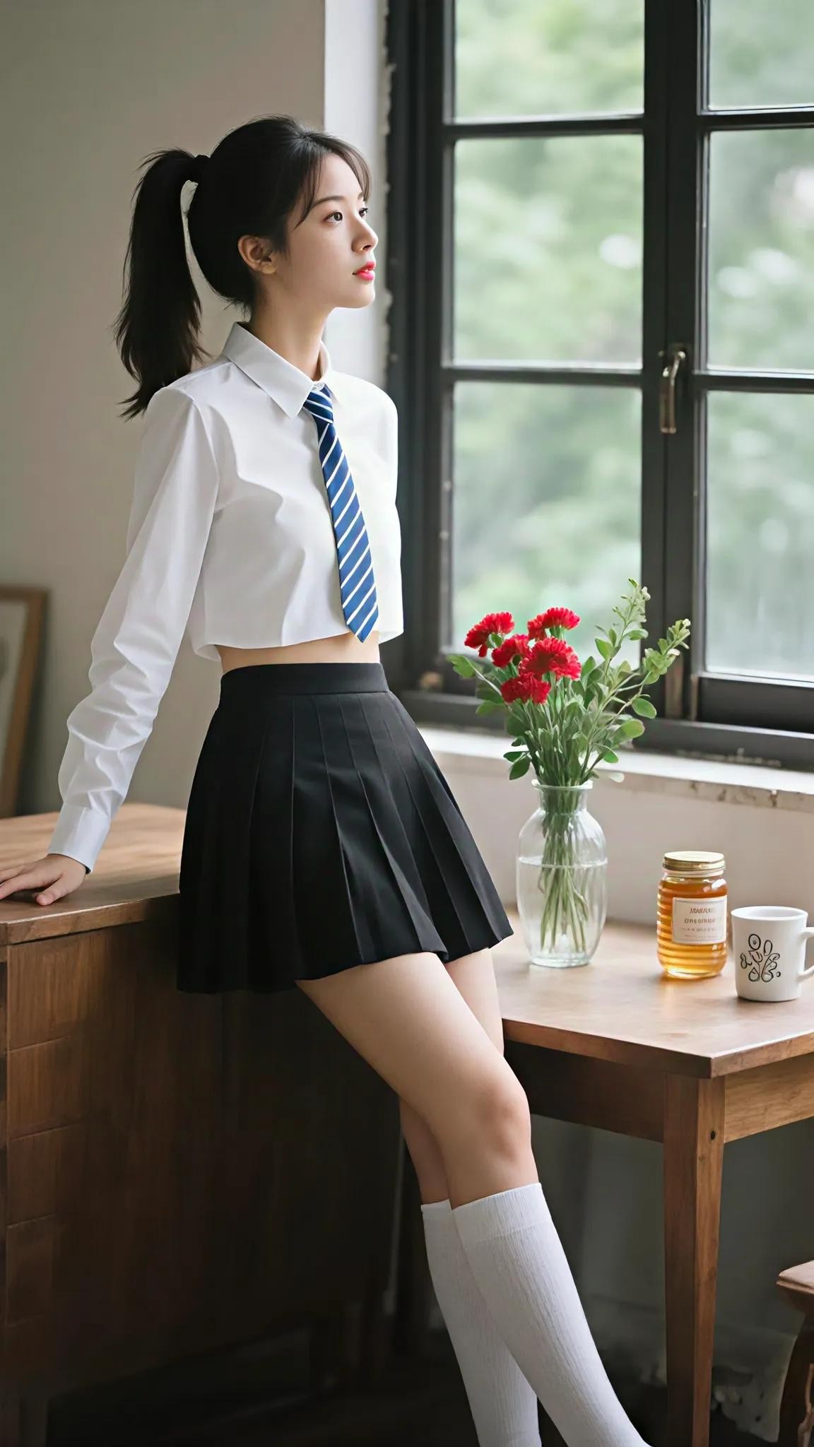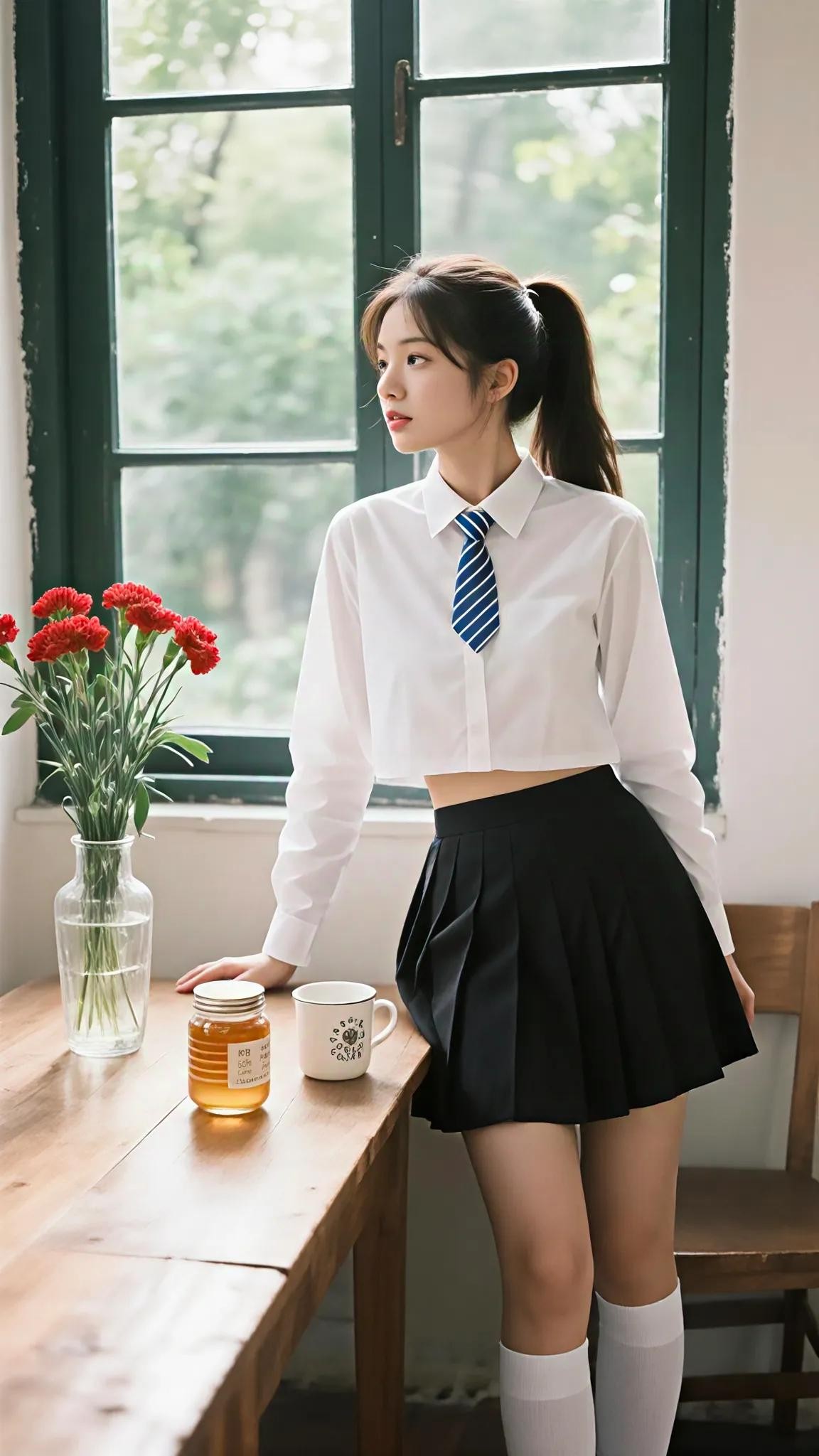 邂逅一位高马尾少女,于窗边定格美好。白色短衬衫搭配蓝白条纹领带,俏皮中透着优雅,黑色百褶短裙与白色长筒袜,勾勒出青春线条。窗外绿意朦胧,窗台上花瓶里红花娇艳,蜂蜜罐与杯子静静摆放 ,自然光线洒下,满是夏日的温柔与烂漫。