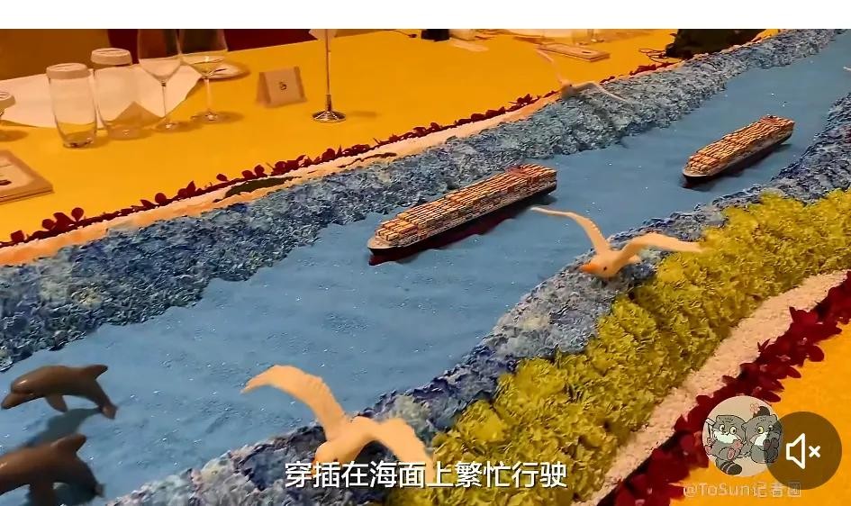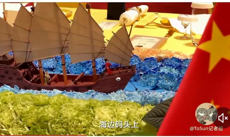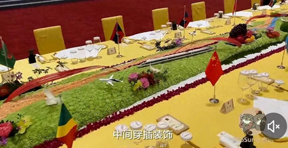 据悉晚宴长桌总长达40米,中间布置了从建筑,历史,工业成就等等中华盛世的代表。