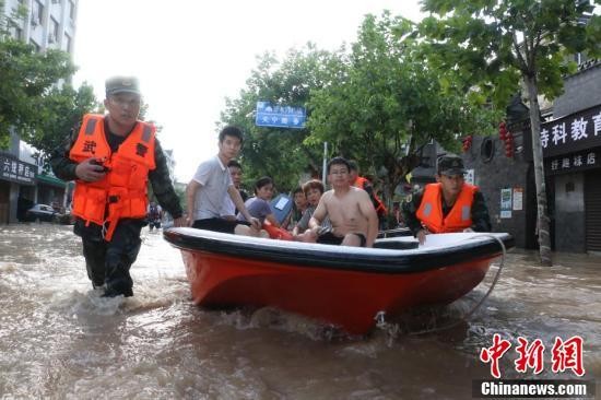 救援队员手推冲锋舟前进至临海市区,在统一指挥调配下,展开救援行动。刘治乾 摄
