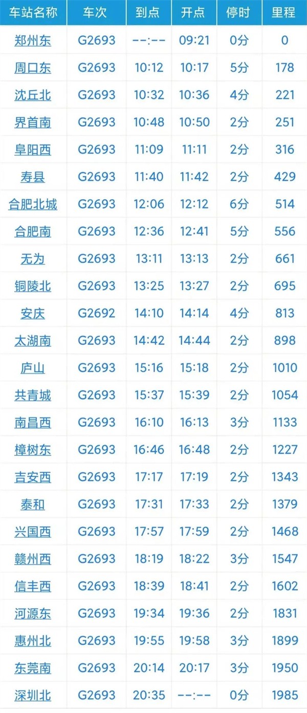 据悉,该趟列车全程停靠25个站点,途经河南、安徽、江西、广东等省份,全长1985公里,运行时间11小时14分钟。