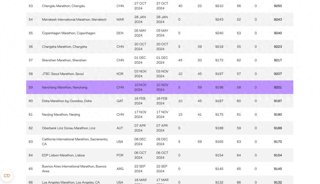 2024南昌马拉松在榜单中再创新高,由2023年第60位上升至第59位!