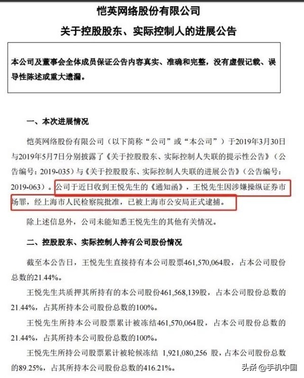 此前的5月6日,恺英网络公告称,公司控股股东、实际控制人王悦因涉嫌操纵证券市场罪被上海市公安局刑事拘留。根据上述公告,王悦直接持有恺英网络股票4.6亿股,占比21.44%,而且几乎质押了其所持的所有股份。