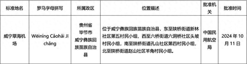 经中国民用航空局批准,新建威宁机场命名为威宁草海机场。根据《地名管理条例》规定,现予以公告。