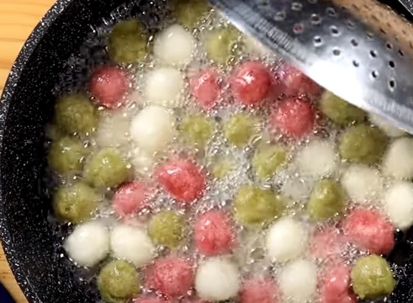 Tips:无论是现做小汤圆或是冷冻汤圆(需先微解冻),下油锅前要滚些糯米粉,可以防止沾黏破裂。