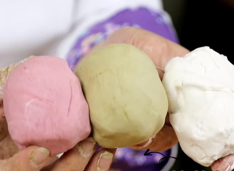 2、取一份面团加入红曲粉、一团加入抹茶粉,皆分别揉到三光。