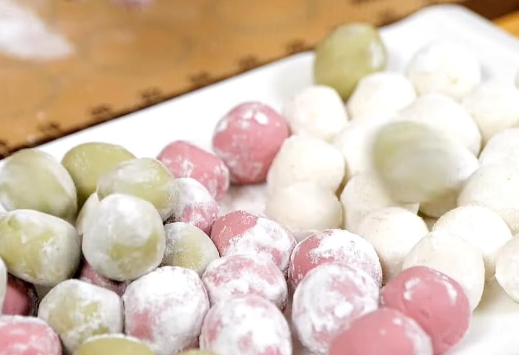 3、3色面团分别揉成小汤圆状,表面撒上糯米粉备用。
