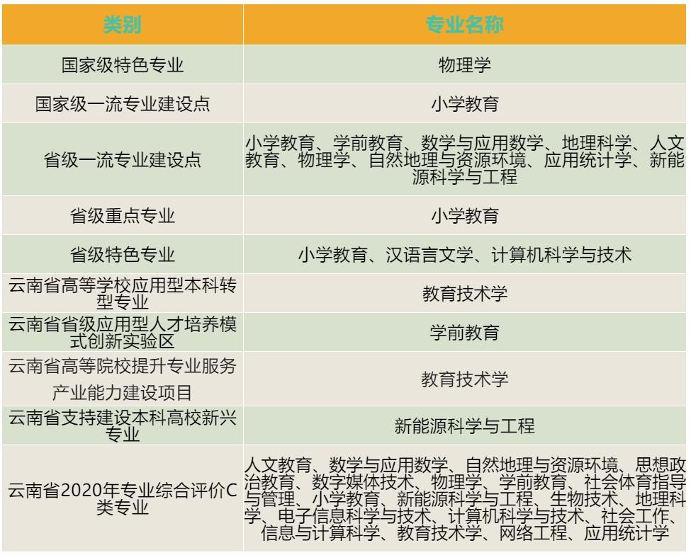 其中较为重要的主要有:2014年被教育部列为“卓越小学教师培养计划改革项目”国家级项目单位。2015年获批为云南省地方大学应用型整体转型改革试点高校。2016年“教育学”入选云南省一流学科(B类高原学科)建设项目,2017年获授为云南省具有公费师范生招生和培养资格的师范院校。2021年被遴选为云南省具有地方优师专项计划招生资格的两所学校之一,2022年学校“马克思主义民族理论政策与思想政治教育”入选云南省一流建设学科(新学科培育计划)。