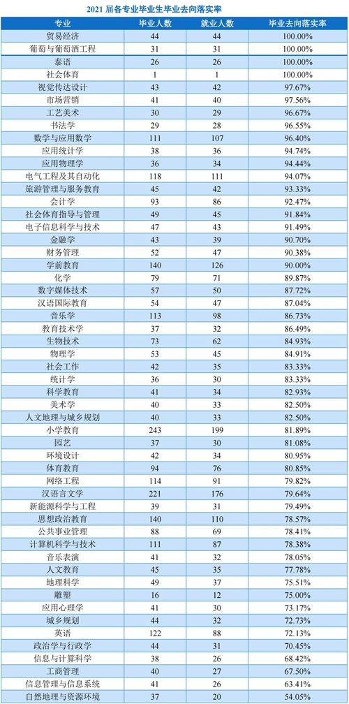 其中毕业去向落实率相对较高的专业为贸易经济(100.00%)、葡萄与葡萄酒工程(100.00%)、泰语(100.00%)等。