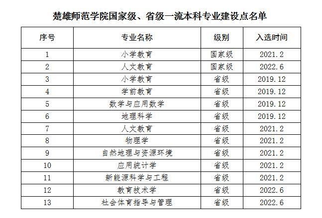 至于一流本科专业建设点,是近几年全国推的重点建设项目,应当作为我们重点的参考指标。根据校方说法,截至目前(2022年中期),楚雄师范学院共有国家级一流本科专业建设点2个、省级一流本科专业建设点11个。