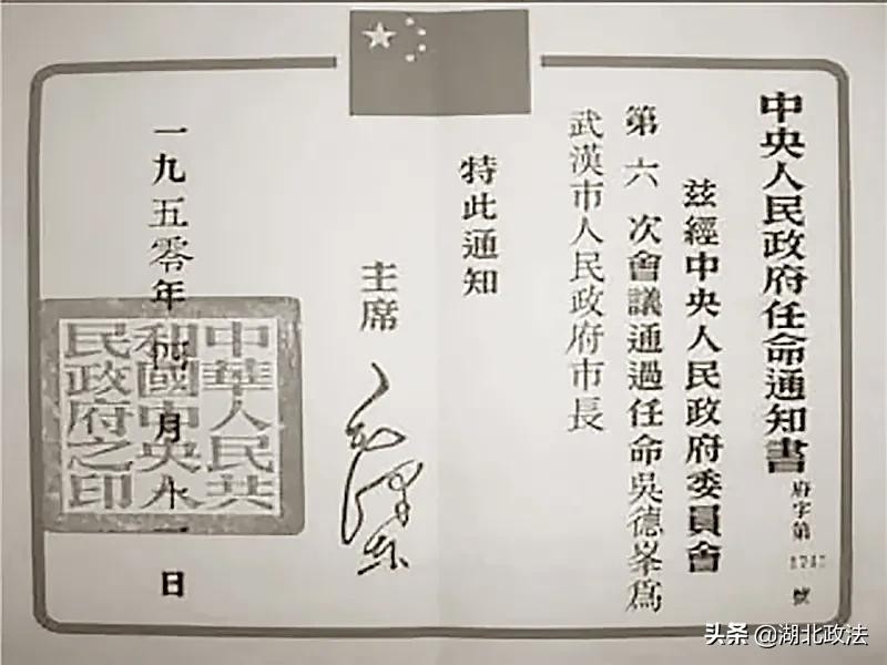 毛泽东签发的吴德峰任武汉市市长的任命书
