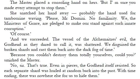 Ministers of Grace没有能力彻底摧毁神格,只能将它粉碎,把每个单独的碎片随机扔回过去。