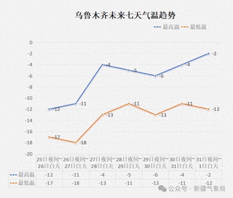 26日傍晚至27日白天城南部分区域、南郊至柴窝堡、西山至八钢断续有5-6级东南风,阵风7-8级,乌拉泊至红雁池阵风9-10级,局地伴有风吹雪,未来两天城区低温-18至-17℃,高温-12至-11℃。