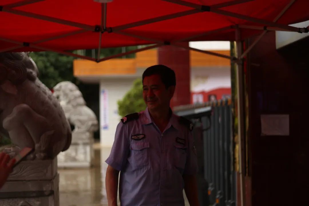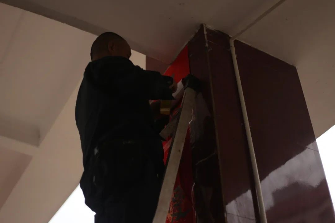 没等多久,暴雨袭来。在校门口避雨时,恰逢保安大叔展现了他们的拿手绝活——贴对联。一人手扶楼梯,另一人手握透明胶布爬上了三四米高的校门,按住红色对联的前端,左右对齐,这才把剪断的透明胶布粘上去。来来往往的学生们看到这条巨大的对联慢慢展开,都纷纷举起手机拍摄。据了解,这是该校的传统,每年高考前都会邀请学校的老教师手写对联,然后张贴在校门口两侧。当问及为何如此细致时,他笑着说:“最后一届毕业生了,以后也不会再贴了,贴紧才能多看几年。”