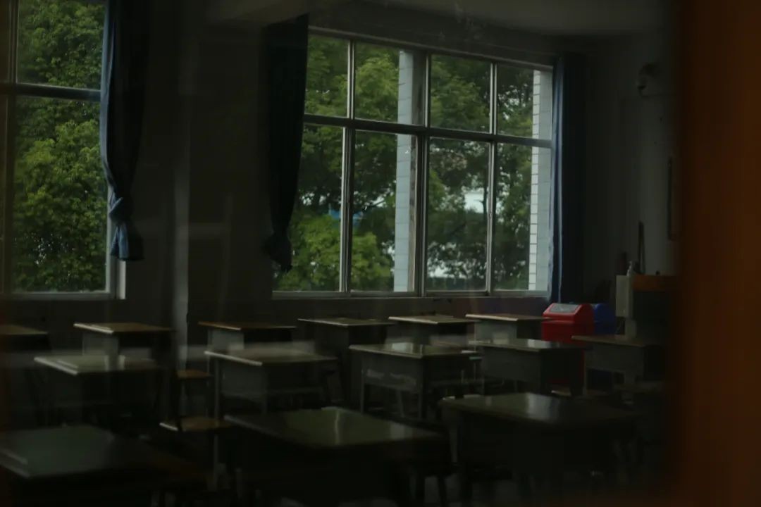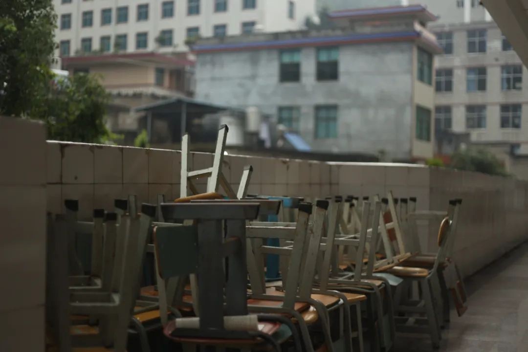 获得允许后,笔者淋着雨进入了高三曾经上课的教学楼。整栋楼显得十分安静,教室偶尔有同学出入,门外的考生服务台上摆放好消毒液,走廊两侧堆放好多余的桌椅。看到这些纯木制的、半木制的桌椅,有的坏了脚,有的伤了面,它们归不在同一类,但却组成了一间间的上课教室,培养了一批又一批学子。