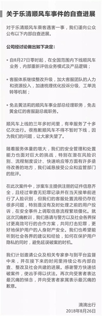 8月26日,滴滴发布《关于乐清顺风车事件的自查进展》的通报。