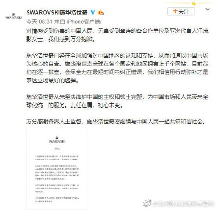 【奢侈品牌道歉大军新添一员,施华洛世奇道歉 ,目前在逐一排查】8月13日,施华洛世奇通过官方社交账号发表声明,就官网上误将香港设置为国家道歉,同时也对无辜牵连到亚洲代言人艺人江疏影表示抱歉。
