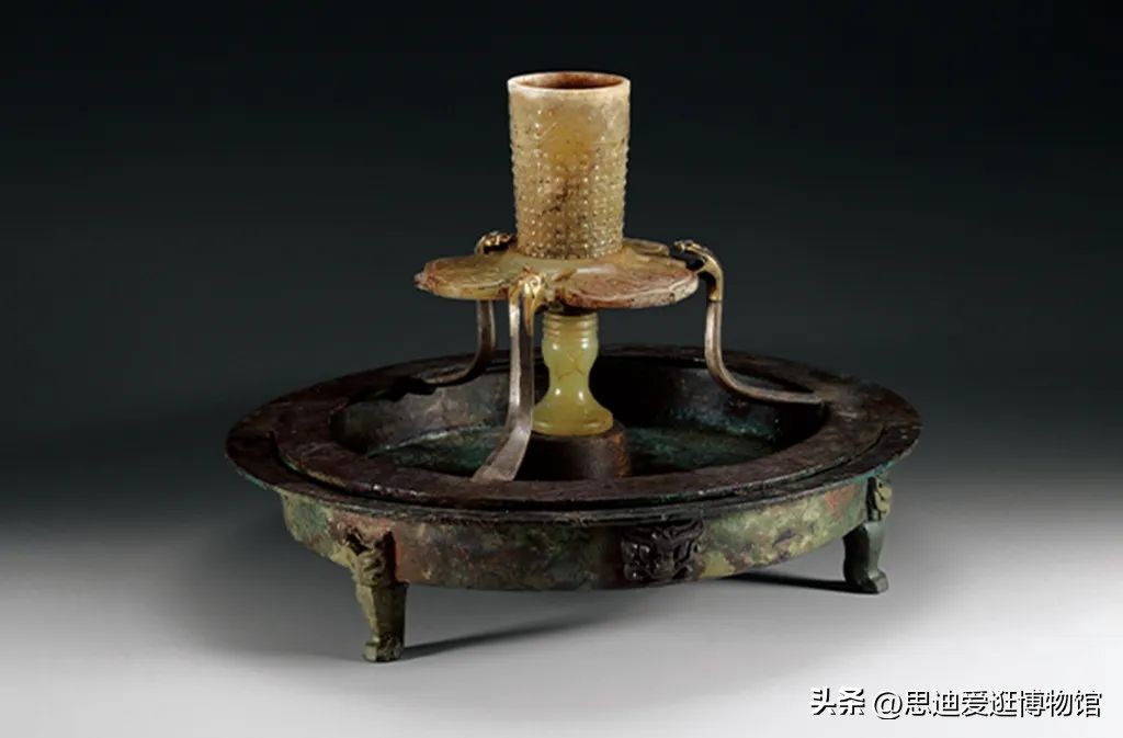 承盘高足杯放在南越王棺椁的头端,由高足青玉玉杯、游龙衔花瓣玉托架、铜承盘三部分组成,造型呈三龙拱杯之势,它共由金、银、玉、铜、木五种材料作成,工艺精巧、造型奇特。 在南越王墓中出有五色药石的实物,所以这件承盘高足杯可能是南越王生前用来承聚甘露、服用长生不老药的器具。