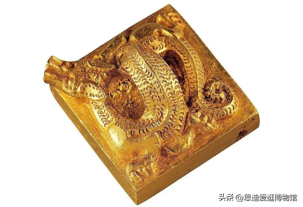 文帝行玺”金印出土于墓主人的胸部位置。印面边长3.1厘米,宽3厘米,通高1.8厘米,重148.5克,含金量是98%。印面阴刻“文帝行玺”四个字,应是南越文王的发布命令的官印。 金印的印钮是一条游龙,盘曲成“S”形,龙头伸向一角,龙身上的鳞片和爪是铸成后凿刻的,龙腰隆起可以用来穿印绶。出土时,金印印面沟槽及印台四壁都有使用和碰撞的痕迹,显然,是墓主生前的实用物。