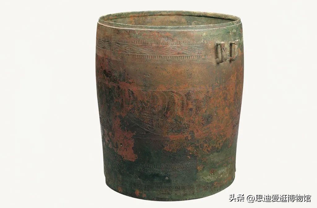 提筒在两广、越南等地均有发现,是一种极具越族特色的器物。南越国的提筒,应是作储酒之用。墓中出土大小不一的青铜提筒共9件,唯有这一件提桶四周有四组船纹。船体明显绘出甲板,船内分舱,满载战利品,其中的一舱内满是铜鼓,船旁还绘有海龟、海鱼和海鸟,并有“羽人”战士提敌首级或执宰俘虏等情形。从船上主要人物的活动来看,反映的可能是一支船队在战争结束后凯旋的场景,也有学者认为可能是在杀俘虏祭海(河)神。