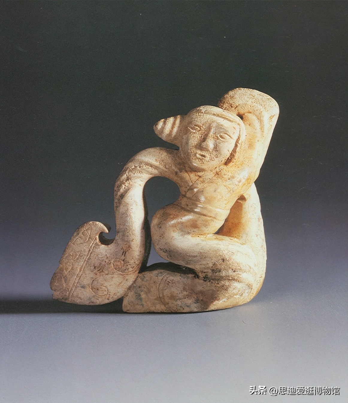 战国至汉代玉舞人都是平雕,这件圆雕玉舞人梳螺髻,着汉服,作“长袖舞”,该舞为汉宫廷舞的一种,流行于楚地。