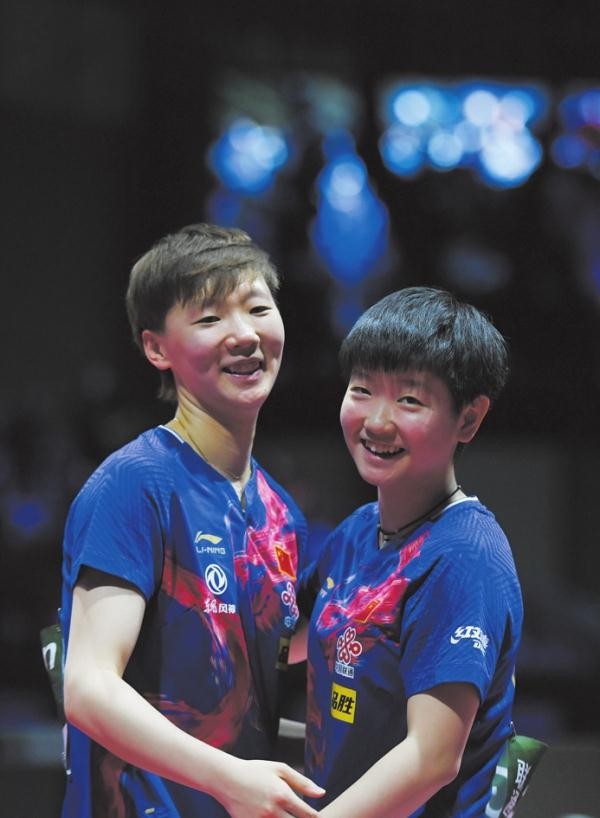 王曼昱/孙颖莎女双夺冠 当日,在匈牙利布达佩斯举行的2019世界乒乓球锦标赛女双决赛中,中国组合王曼昱/孙颖莎以4比2战胜日本组合伊藤美诚/早田希娜,夺得冠军。 (新华社记者 陶希夷 摄)