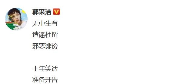 24日晚,郭采洁发文辟谣,霸气宣称:“无中生有,造谣杜撰,邪恶诽谤,十年笑话,准备开告。”并表示:“没有瓜,不用板凳,清白简单清楚,抓一个告一个,请放心,不要随便跟我开玩笑。”