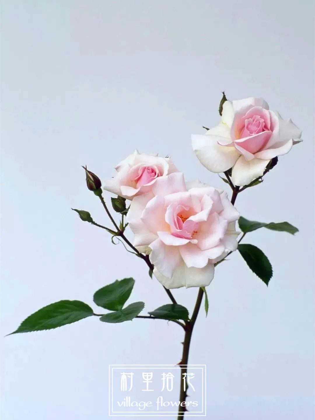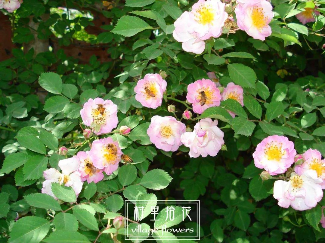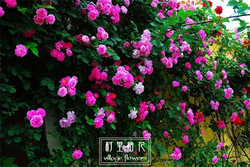 蔷薇:爬墙而生,叶子下面有绒毛,多朵簇生于枝头。