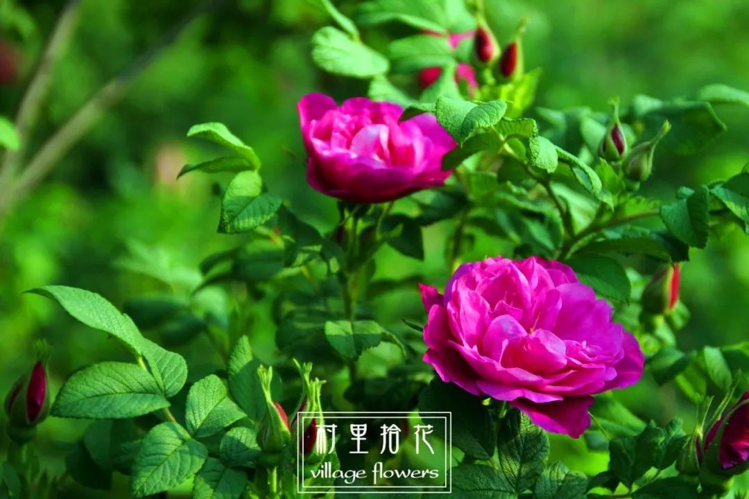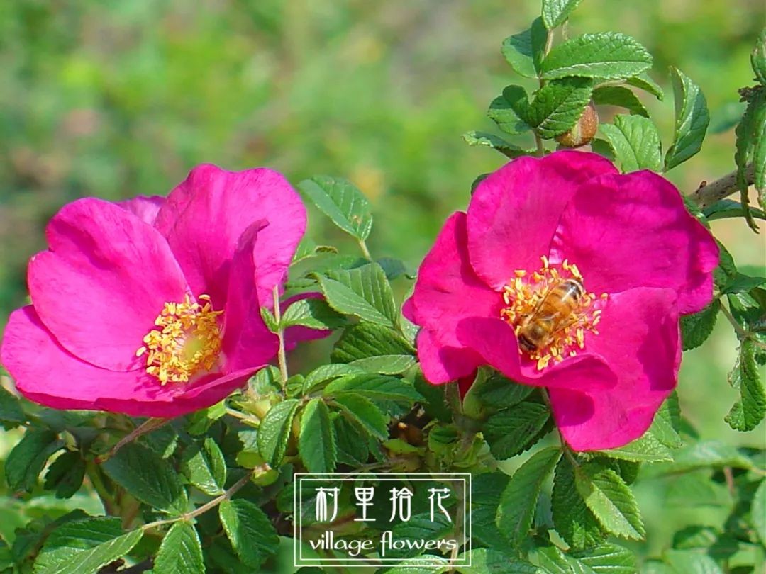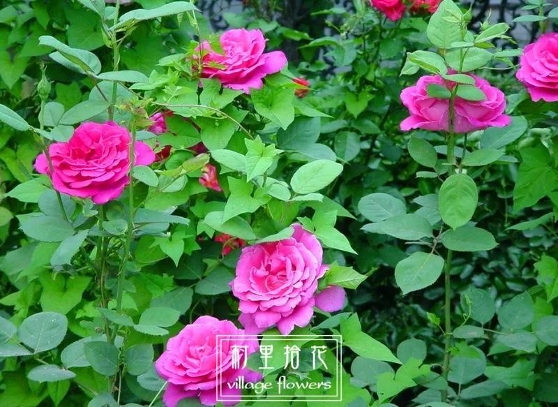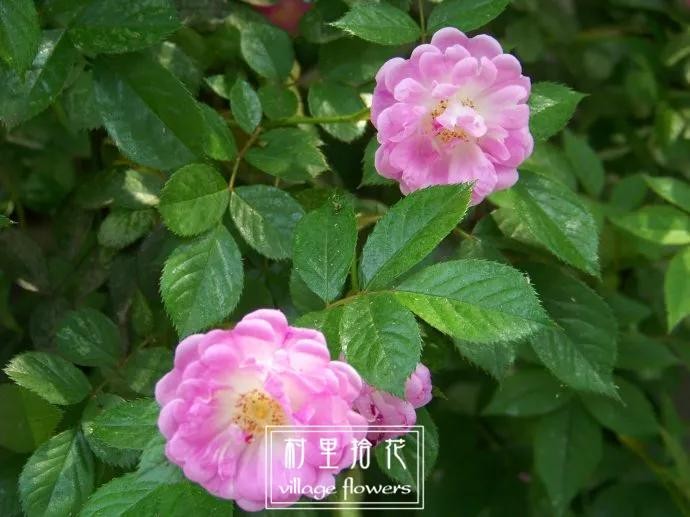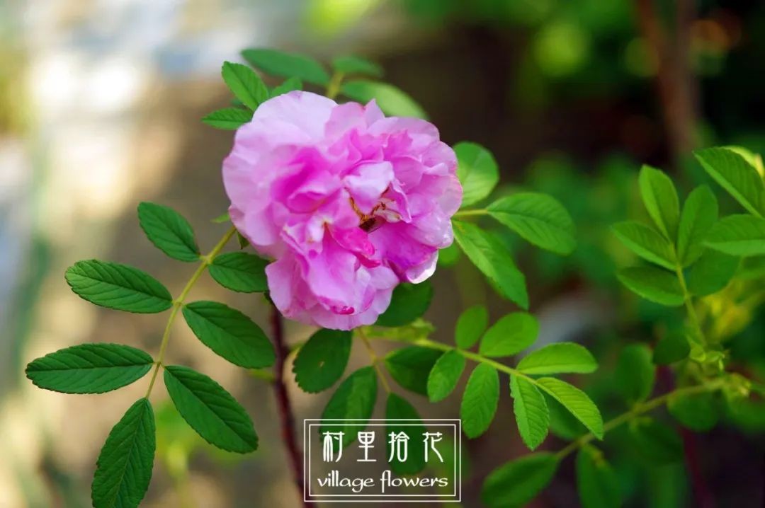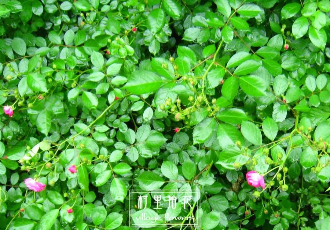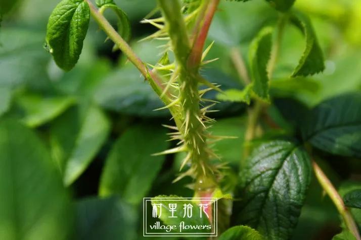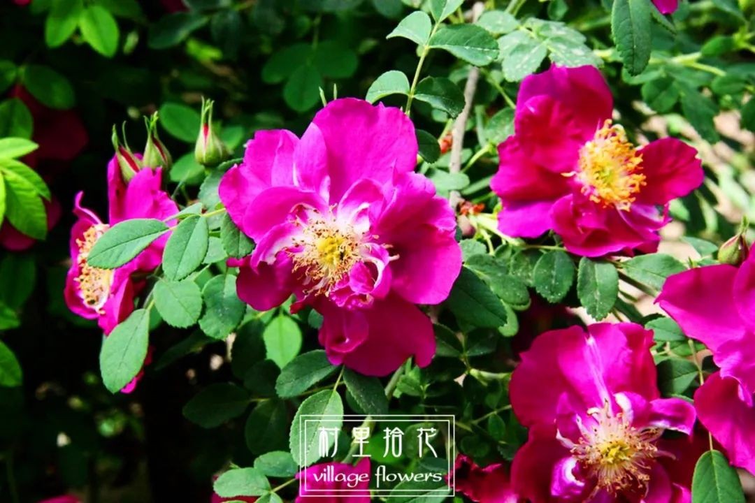 玫瑰:5-6月开花,叶脉凹陷,叶面多皱纹,刺又多又密且有绒毛,有浓郁花香,花型摊开;