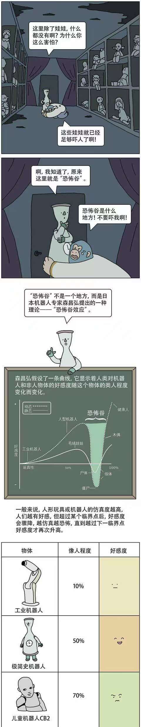 恐怖谷效应是指当机器人的外形与人非常接近的时候,人们产生的一种心理恐惧的效应。下边让我们看一组图片来更好地了解一下什么是恐怖谷效应吧~放心~图片不害怕的哈~