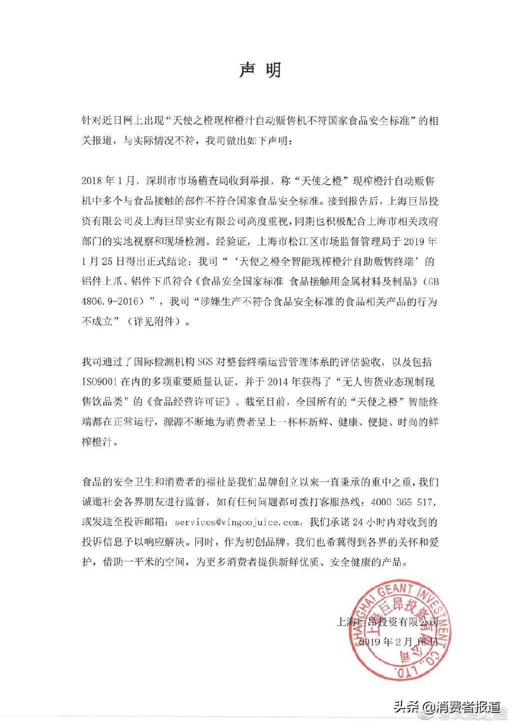 对此,“天使之橙”品牌拥有方——上海巨昂投资有限公司,2月16号晒出了上海松江区市场监管局的认定,显示产品符合要求,不予处罚。