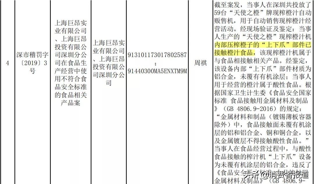今年1月,“天使之橙”被深圳市市场监管部门开出119万元的罚单,原因是鲜榨橙汁机内部的铝合金抓头没有镀膜,直接接触酸性食品,涉嫌违反《食品安全法》要求。