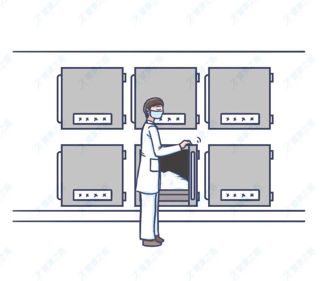 尸体待医生确认死亡后,会被放进一个睡袋状的袋子里(即“尸袋”)。再被推进停尸间,放到专属的尸体冷藏柜内。