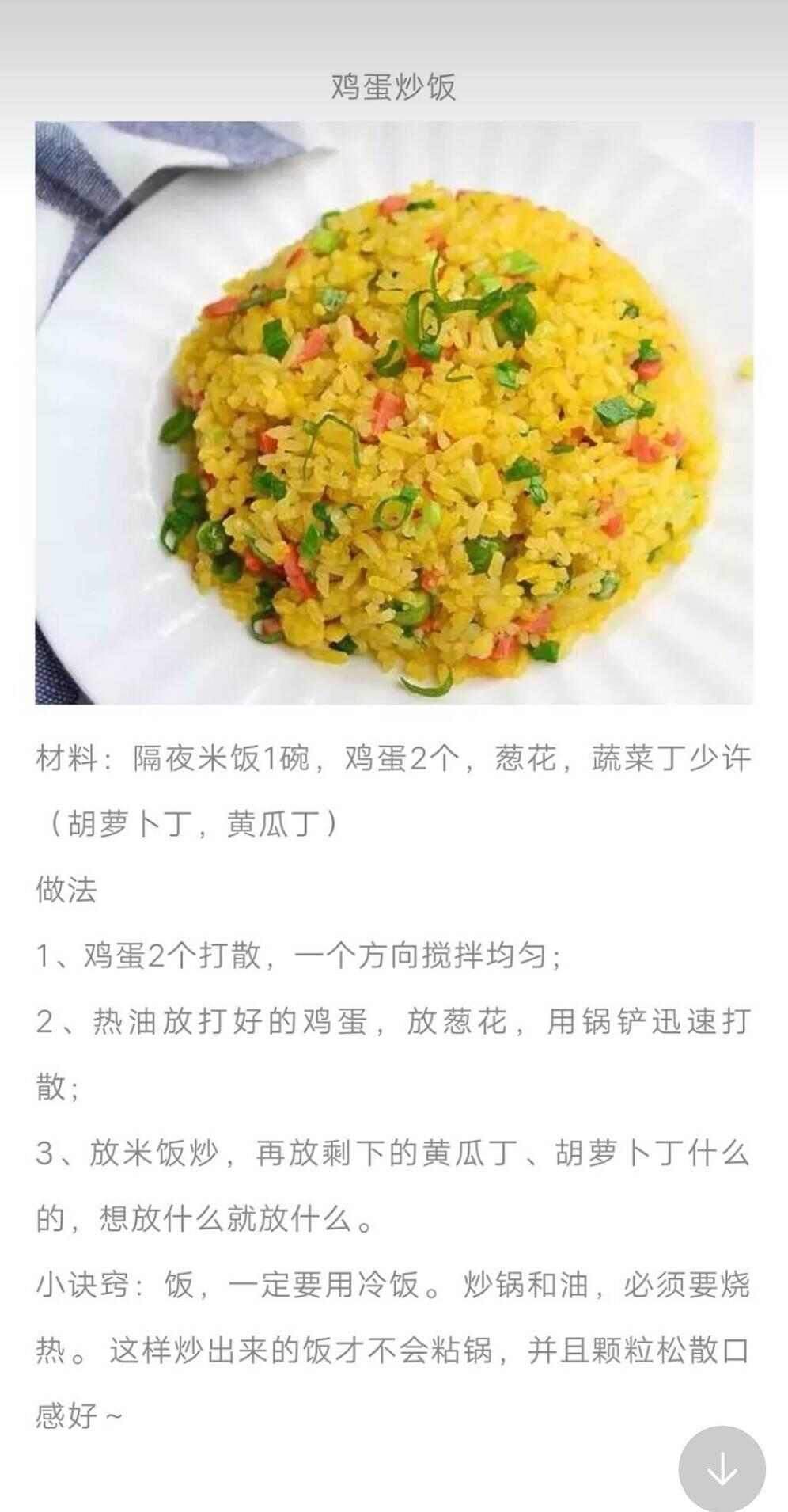 像我们在酒店比较有特色的炒饭一般都是蛋炒饭,酱油炒饭牛肉炒饭等等,他的做法呢?也都比较相似。如果你在家里面只想吃一份蛋炒饭的话,就不要弄得太麻烦。一个鸡蛋一碗饭,就把蛋炒饭炒好了。不需要像扬州炒饭一样,放火腿呀,放笋子啊等等,我们吃的就是这种蛋炒饭的简单的味道。