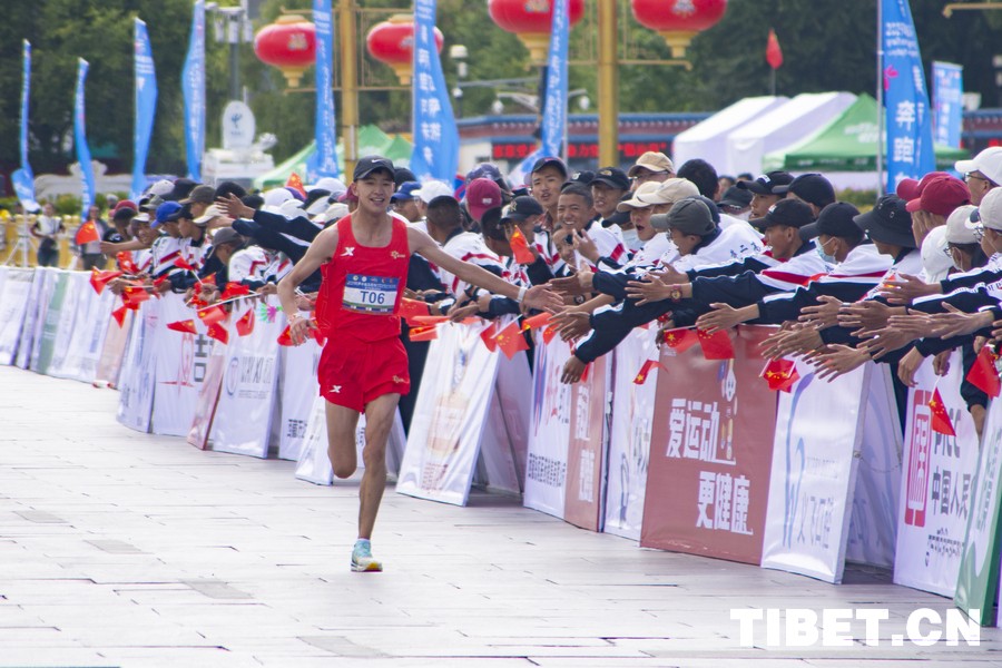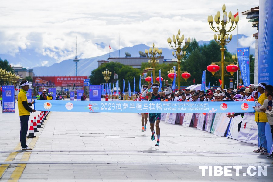 图为2023拉萨半程马拉松男子组冠军索朗才仁冲线瞬间 摄影:赵振宇