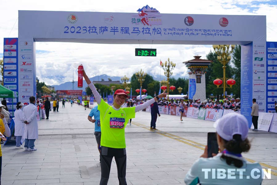 图为2023拉萨半程马拉松女子组冠军次仁措姆冲线瞬间 摄影:赵振宇