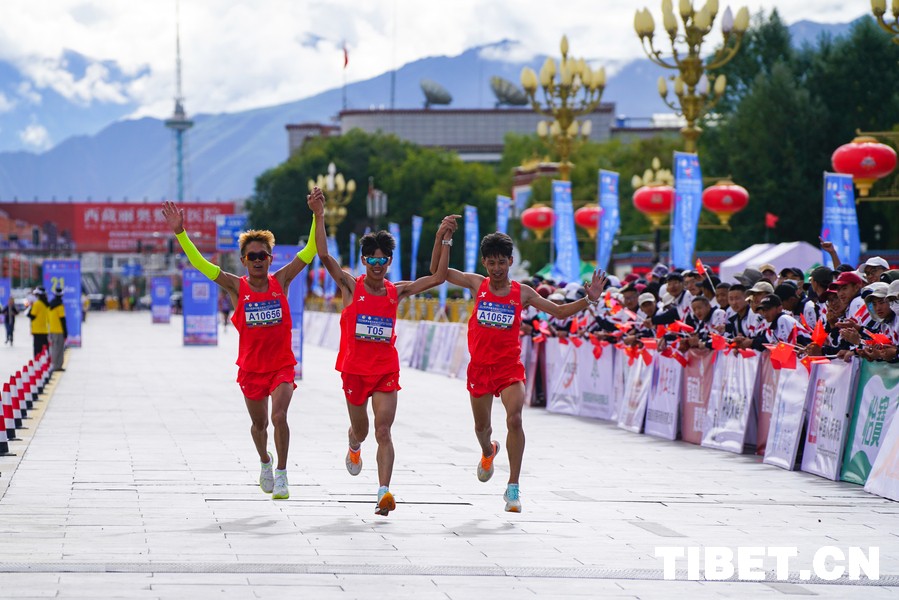 图为2023拉萨半程马拉松运动员携手冲线 摄影:赵振宇