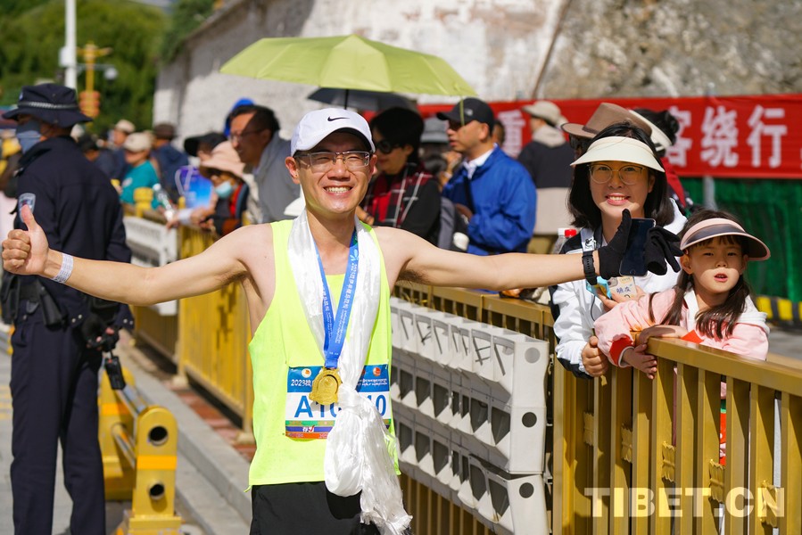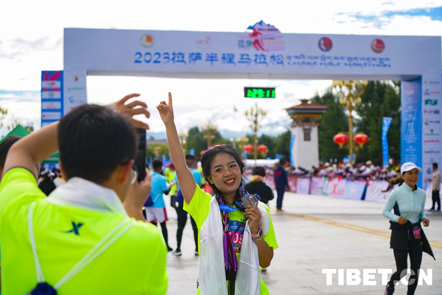 图为2023拉萨半程马拉松跑步爱好者在终点处拍照留念 摄影:赵振宇