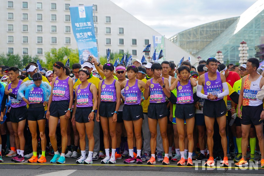 图为2023拉萨半程马拉松起跑线前运动员出发准备 摄影:赵振宇