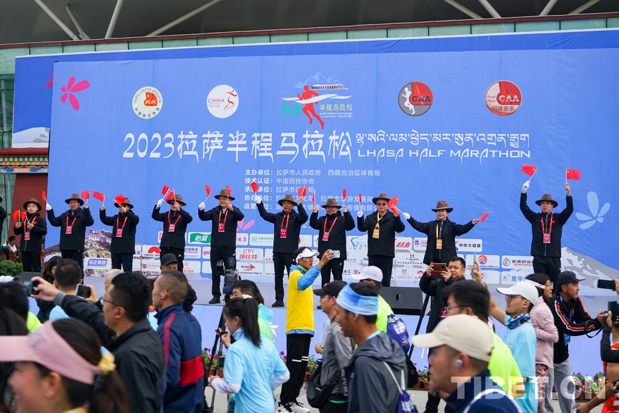 图为2023拉萨半程马拉松起跑仪式,出席领导为运动员摇旗加油 摄影:赵振宇