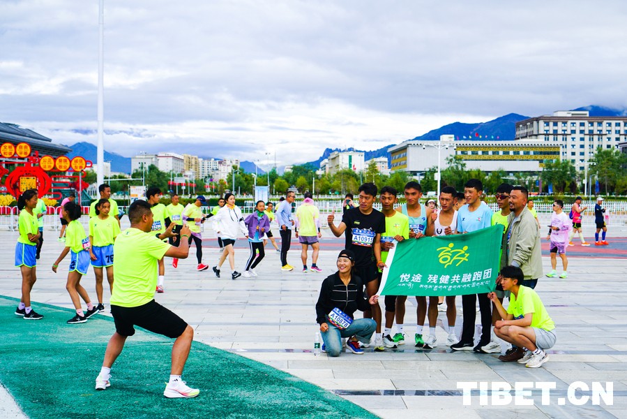 图为2023拉萨半程马拉松开跑前跑步爱好者们热身准备和拍照留念 摄影:赵振宇