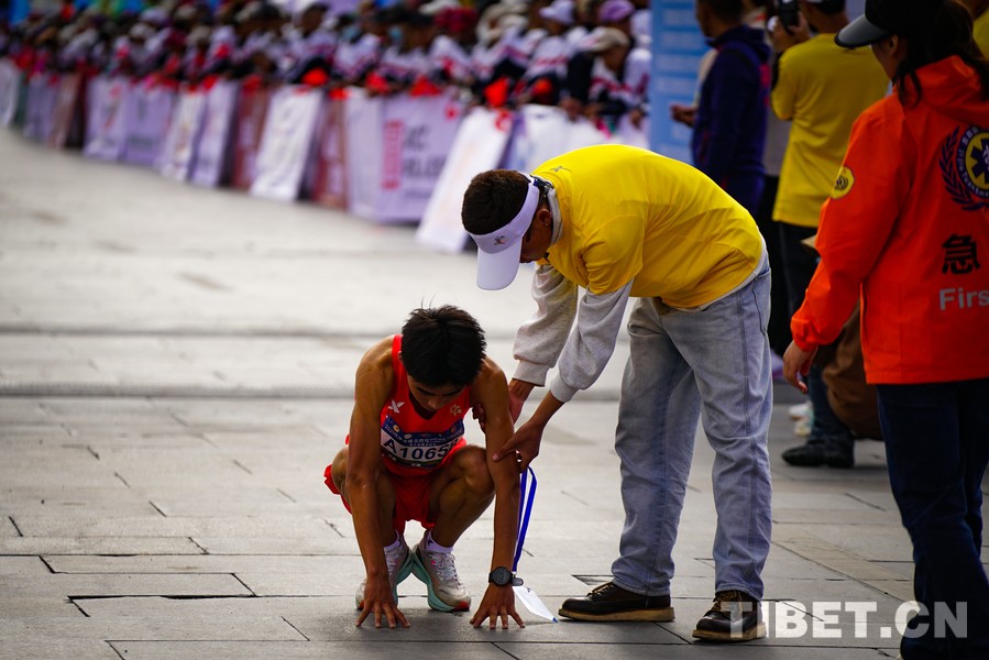 图为2023拉萨半程马拉松运动员完赛后工作人员予以帮助 摄影:赵振宇