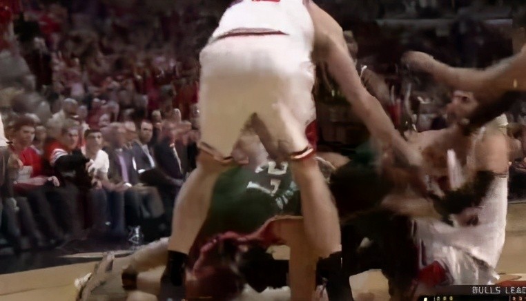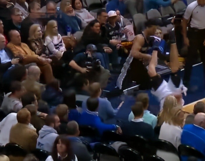 在倒地的一瞬间用双腿踢到了丹尼-格林的脸部,格林瞬间爆发跟扎扎战成一团,结果两人都被吹了技术犯规。